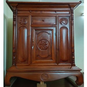 Tủ thờ gỗ được thiết kế theo hình khối hộp chữ nhật vững chãi và chắc chắn. Mặt trước tủ được sử dụng hoa văn như: đục tứ linh, long ly quy phụng, 3 ông phúc lộc thọ, tam đa, chữ tâm , chữ phúc,… đục chạm uyển chuyển tạo nên sự hài hòa trong toàn bộ thiết kế, đậm chất cổ điển thường thấy trên những mẫu tủ thờ gia tiên.